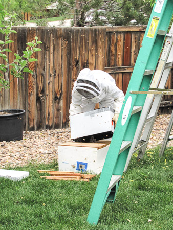 THUMP--dumping the bees from the cardboard box into the wooden box