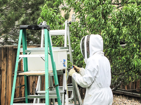 Positioning the wood box close to the remainder of the swarm and opening the port for the rest to enter