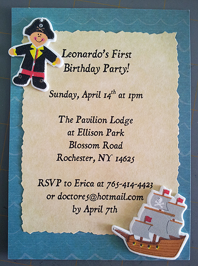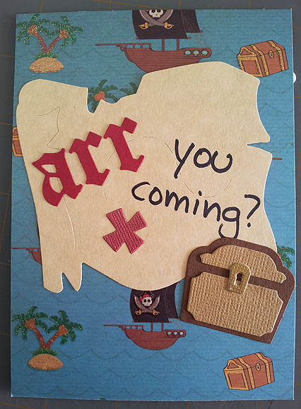The other big event in March is that my mom and aunt came to town for a visit! We had a great time--we went shopping at the Loveland Outlets, did a card class at Archiver's, went to an Avalanche game, attended a scrapbooking expo (where of course I spent too much), got snowed in one day, and most importantly, and the whole point of the trip, we made birthday party invitations for my nephew Leonardo's first birthday! It had to be a joint effort because my mom bought the diecut of the map, the patterned paper, the foam stickers, and she made the little treasure chests, but I did the 'arr' diecuts, the writing, and the layout of the text on the back side. The party theme, of course, is pirates. What do you think?