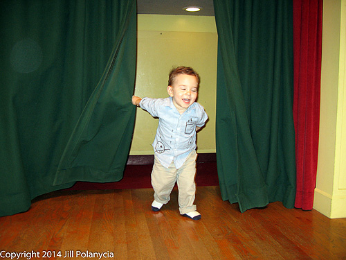 There is a LOT to do in the museum. There's a mini supermarket, mini post office, a pirate ship, an airplane, a train you can ride, a victorian room, and a theatre where you can dress up in costumes and perform on stage. Leonardo saw a little girl on stage and just had to imitate her grand entrances!