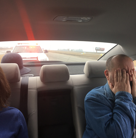 The following morning we got stopped for speeding near Grand Forks, ND, by a lovely state trooper. JC isn't hiding to protect his identity, he was just rubbing his eyes at the moment, but it's a pretty awesome shot. Luckily the ticket was a whopping $50.