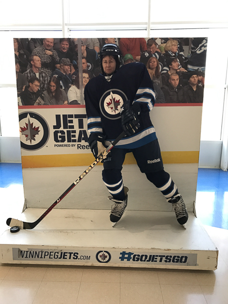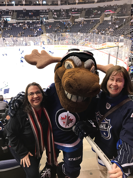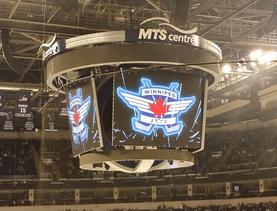 At the Winnipeg hockey arena! We scoped the place out during the day and returned for the 7pm game between the Winnipeg Jets and Vancouver Canucks (yes, again, ugh). This time, though, the home team won!
