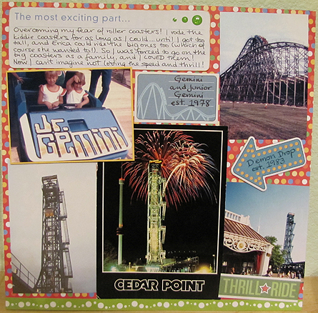 August 2011So after my hectic months of May and June, July was spent staying home, scrapbooking, and doing a wide variety of things. My watch???Our first event was going up to Loveland to attend the Masters of Magic festival. It's a 2-hour show featuring a variety of magicians, and JC and I went because our main man DAN SPERRY was performing, and actually closing the show! (Which is a good idea because I'm not sure many people can follow the act who swallows razor blades and plays russian roulette with an unsuspecting audience member!) Dan rocked, of course, and after the show we got to meet him and say hi. But there was another unusual event during this show--I was part of another magician's act! An Israeli magician named Asi Wind picked me out of the crowd and asked to see my cell phone. He made it disappear and then couldn't make it reappear, so I had to go back to my seat without my phone! He then did a few tricks with some other audience members, and then called me up to the stage for more antics. He took a $20 bill from me, folded it up with his own $1 bill, and made the $20 disappear, then made it reappear tucked inside my watch band! I did not feel a thing. Next, he made the $20 disappear again, and brought over this huge box that had been sitting on the stage the whole time as a consolation prize (since he has now at this point misplaced my phone and my money). It was a nesting set of boxes, all wrapped in an elastic ribbon. After finding and opening three nested boxes, there was a velvet pouch with a rubber band around it. He made me hold it up and say "I can't believe my cell phone is in this bag!" then say "I can't believe my cell phone and my money are in this bag!" Then he made me say "I can't believe my cell phone, my money and my watch are in this bag!" and when I got to saying "my watch..." I looked down and my watch was GONE! I DID NOT FEEL A THING! I opened up the bag and sure enough, my phone, $20 and watch were all inside. I have NO idea how he did that, especially since my watch is pretty well set on my arm and takes a bit of effort to get off! She Shoots...She Scores!The next big event of the month was that I started to play hockey with the DWHL again! I originally registered for the Summer League back in May but had to drop out due to still having my hand injury. But in July they offered half-league rostering to help fill the locker rooms as a result of injuries and vacations. So I said 'what the heck' and ended up back on the Nordiques, the only team I've ever played with! I was nervous about playing again, even though I had been doing an adult clinic every Friday at the Y for the last month, because I wasn't sure I could perform in game-paced situations. But I found that while I am a bit rusty, and not so competitively motivated anymore, it's just like riding a bike and I did just fine. I even scored MY FIRST GOAL at my FIRST GAME BACK! My coach said to just shoot from the point if us defensemen ever get the chance, and I definitely need to practice shooting more. So in one of those rare moments when the puck came back to me, AND I managed to keep it inside of the zone, I took a nice, hard wrist shot, it bounced off a couple of players' skates, went straight to the net, and bounced off of the goalie too! In the DWHL you get to keep the puck from your first goal so I wrote the date on it and it's sitting proudly on my shelf with all of my "real" pucks. Now I can officially retire because my goals were to score a goal and to win a championship (of which I have two). So theah! And since joining the Nordiques, we haven't won a game! Hah! So much for helping the team! Theatre and OperaOther than being totally exhausted and messed up in my sleep schedule from these bloody late night hockey games, we attended a few cultural events. We saw "A Comedy of Errors" in the gorgeous outdoor theatre at University of Colorado at Boulder as part of the annual Colorado Shakespeare Festival which I just love to go to every year. We also went up to Central City, which is an old mining town a little ways up into the Rockies, on two consecutive Sundays for some matinee opera. The first time we saw a one-hour opera called "Gianni Schici" about a family who fights to change their dead relative's will to get his posessions instead of the monastery to which he left everything. They know of this guy in town Gianni who could help them, and they ask him to pretend he's the dead relative, narrating his will, as he's dying. He goes ahead with it, but includes himself in the will. It was really funny. Since it was so short we then went to the nearby town of Black Hawk, did a bit of gambling, and had a very nice dinner. The second time we saw "Carmen" which was really great, and in French! Bonus that I could understand it! (They of course have subtitles but it's nice to have a clue.) Before the opera we went back to an antiques store right next door where the week prior we had fallen in love with some cellar doors. They said they were antique wine cellar doors, and they looked like they were 1700's/early 1800's. They were like 7 feet high and just extremely ornate and inticate black steel woven into a beautiful almost goth pattern. We decided to ask how much they were, thinking we would totally snag them if they were $1,000 or less. Turns out the woman that was there knew that they were old, but not from when, that they came from a famous location, but couldn't give us more details, and because of these two facts (which were not facts at all), the price was $28,000. Um. No. My Latest Scrapbooking ProjectSince I did have so much free time in June and July I started another album. This one is strictly for all of the Cedar Point vacations that I've taken in my life. My family has been going there since 1981, so it's a very special place to me. And the last time I went, they had a Cedar Point album and pack of papers and embellishments, so of course I could NOT pass that up! So I'm only up through 1