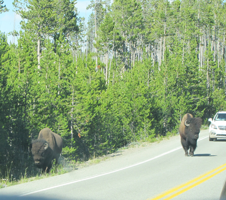 - The biggest adventure of the month was that I took a drive with all of JC's family (except JC) to Yellowstone. We consisted of JC's parents, sister, her three kids, and our nephew's girlfriend. We drove up in a caravan of two cars on Monday and stayed overnight in a very nice ranch just outside of Cody, Wyoming. We followed the main loop road through the park on Tuesday, and drove back home on Wednesday. It was quite the whirlwind trip, and this is the second time I've done that. I feel like I did see different things, though, and got to see a lot more wildlife like several bison, a couple of elk and a grizzly bear in the distance. Next time I'd like to stay in the park and hike some of the trails to the lesser-known parts of the park. Anyway, here are some of my favorite photos. These first two were taken en route, so we were somewhere in Wyoming. Birdies hanging out in the park. One of the largest hot thermal pools. Old Faithful erupting. This little cutie enjoying a snack! These big cuties crossing the road. Me in a vintage barber's chair in the saloon on the ranch property where we stayed. The bottom floor was decorated like a western jail and that's where we had breakfast. This second floor had a bar, a lot of areas to sit, and a place for live music at night. A gorgeous canyon we drove along on the way home. Keeping busy and having fun!