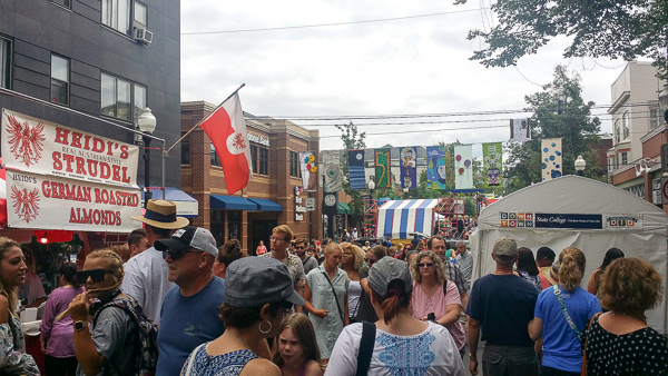 The next day we walked all over ArtsFest, checking out all of the booths. I bought a beautiful hand-cut really intricate piece of art made from paper: it's a heart full of floral vines and leaves with two birds kissing in the middle. I also bought some hand-made wooden utensils. Couldn't do much more than that because my suitcase was already overweight with scrap crap! Here's the scene down one of the main routes. The roasted almonds were amazing by the way.