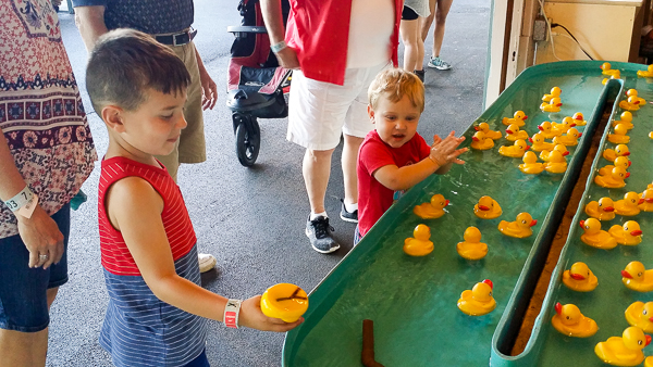 The boys "playing" a duck game, where every single duck has a letter on the bottom coordinating to buckets with prizes in them. Leo got an inflatable guitar and Domenico got an orange snake.