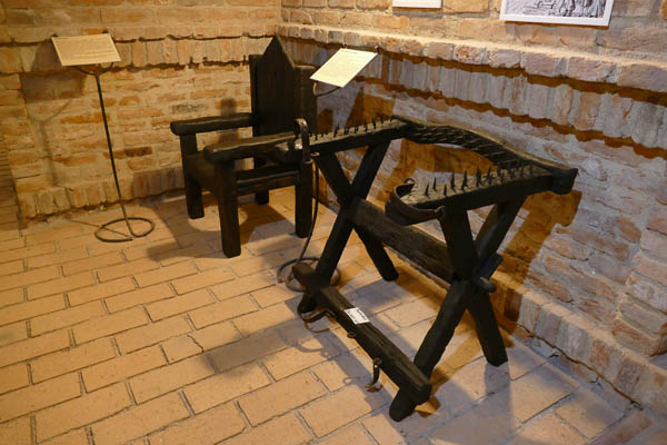 But the most bizarre thing in town is the Museum of Torture Instruments. It may not surprise you that this is not my first torture museum visit...but it was certainly the BEST. This museum gets five stars from me because it has an enormous collection of artifacts. Some might be reproductions, but if they are, you can't tell. It's all underground in this maze of tunnels with chanting music playing throughout. All of the items had excellent descriptions of what they were and how they were used. The walls had old drawings or etchings of the devices in use...and even a few modern-day photos. Super creeps. I took photos of everything, including the English guide book with all of the descriptions! Here are two super comfy chairs.