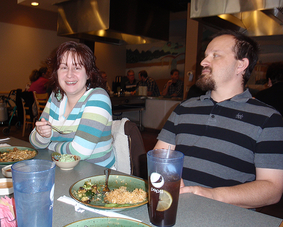 December 2011So November was not nearly as eventful as October was, and that's a good thing, because getting Christmas ready one month earlier than usual was quite stressful! I spent all of my Sundays wrapping presents, making Christmas cards, and getting packages together to send out to our families. We did get to a couple of concerts--Judas Priest, for the second time!, and VNV Nation for the, oh I don't know, like third or fourth time. Judas was actually better than they were the last time we saw them a couple of years ago. Rob's voice was much better and they had a new (young) guitarist who seemed to just revive the band and provide some youthful energy. They said this was their farewell tour, but I'm pretty sure they said that on the last tour as well...and as for VNV, well, they always just flipping ROCK. In addition, our family celebrates both my birthday and my father-in-law's birthday in November. (Yes, JC married his dad!) This year we had a really nice celebration at Mt. Fuji which is a hibachi-style place. The food was SO good--they made THE BEST fried rice ever! Our nephew Mike and I also split some sushi as we are the only ones that like it, and it was just amazing. Here we are stuffing our faces: