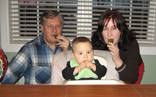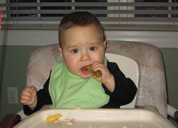 After dinner, we tried the pickle experiment. JC's parents said that they gave pickles to all of their kids and grand kids when they were teething. The baby can't puncture through the skin or bite pieces off, but the taste and texture are things that they've never experienced before. So we gave Leonardo one of my mom's homemade pickles (which are not as tough or tart as the ones in the grocery store) and he loved it!
