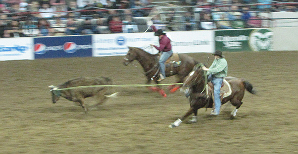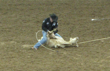 Calf Roping: not my favorite event, but a calf is released out of a pen and a cowboy has to rope its back feet, then get off the horse and tie three of its feet together in record time.