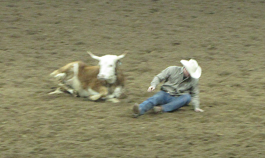 Steer Wrestling: A cowboy is on a horse, and he has to ride up next to the bull, jump off of his horse onto the steer, and try to wrestle it to the ground. Bull: 1, Cowboy: 0.