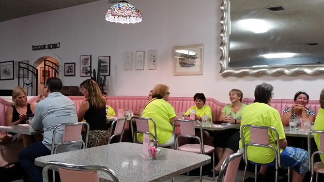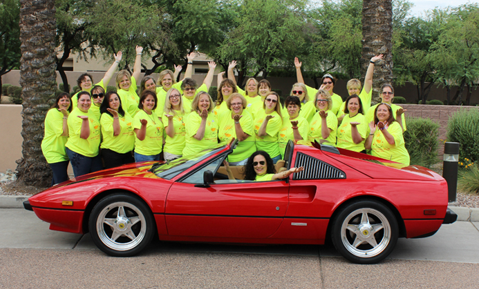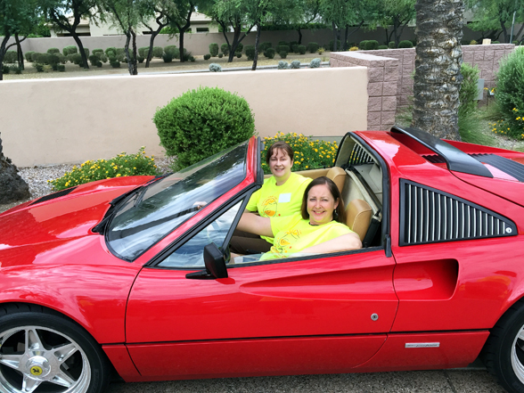 The next morning there was a surprise photo op waiting for us and it turned out to be a 1980's red Ferrari outside! So of course we had to have a group photo in our "safety yellow" reunion shirts, hah!