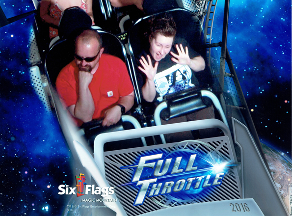 Other coasters I thoroughly enjoyed were: - Twisted Colossus: old wooden ride famous from many movies, it got a makeover last year in that it now contains two tracks that you get to ride in one ride. Also, the track is now a smooth steel track, allowing you to go upside down. It doesn't look like you flip over because the train you ride in is still one of those traditional wooden coaster trains. It had some great dips, angles and loops by golly. You first rode the blue track, then rode the whole thing again on the slightly-different green track. - X2: another revamp of an old coaster, it's touted as 5-dimensional. You ride on the outside of the track like on Green Lantern, but the seats flip you over at opportune times during the ride. Plus you have speakers right by your head, there are flames, smoke, etc. We managed to only ride this once on Saturday, after it broke for 15 minutes, because it broke again on Sunday. I kid you not! - Apocalypse: great wooden coaster, and unlike many of them, not very jarring. Super fast, great angles, and rather long. - Full Throttle: magnetic technology is used, like on Maverick at Cedar Point, so that you get shot straight out from the loading area into full speed in seconds. You first go through the largest loop in the world, then twist and turn and flip over throughout the course...until you get to the tunnel. You stop in the tunnel, and go BACKWARDS for a short period on the track. When you lose momentum and fall forward again, and get to the tunnel, the magnets accelerate you to go through the rest of the course super fast. We rode that one twice and managed to figure out where the camera was, so naturally, this happened.