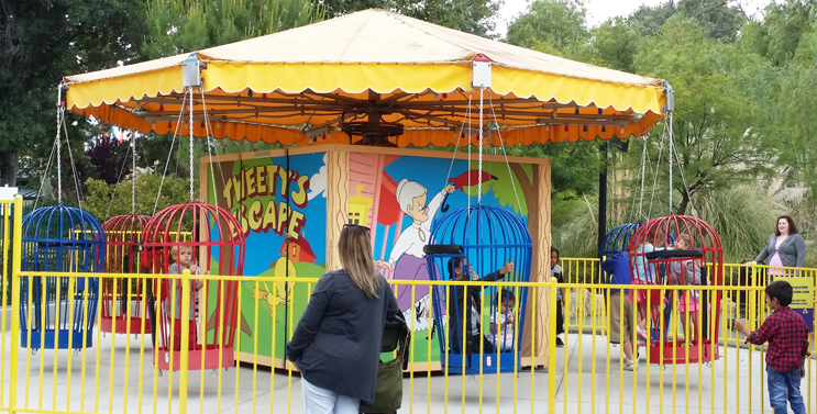 After a transmission-slipping rental car fiasco, we got a new car, checked into the hotel, and made our way to the park. Let me just tell you--THIS AIN'T NO CEDAR POINT! The first ride we got in line for broke at that very instant. We moved on to ride the swings, then got in line for another roller coaster, Goliath. The wait was TWO HOURS and it was NOT worth that! It was a simple steel looping coaster--built in 2000, the same year as Millennium Force which would kick this coaster's ass. We began to panic, wondering if we were going to have enough time to ride everything! Luckily, it was just that one freakish ride that had a line that long. We managed to ride a few other coasters that night, as well as check out the kiddie land, which was Looney Tunes themed. I cannot get over the cage ride, though. Priceless.