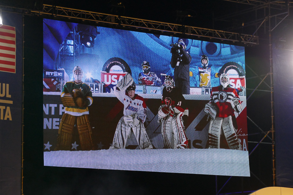 I think the best part of the night, though, was the GOALIE RUN! Just for fun, four crazy guys dressed head-to-toe in goalie gear went down the course. It was HILARIOUS. It's like watching Sumo wrestlers try to ice skate.