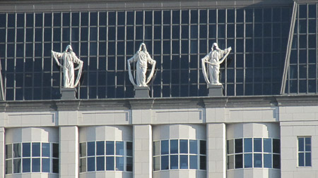 Creepy faceless statues atop a building.