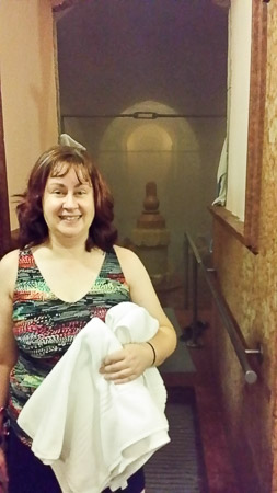 On our walk back, sipping warm mulled wine, we got word that our friends Ken and Mary had arrived. They booked a longer, different Viking river cruise starting around the same time ours did, out of Budapest! So they arrived, got to their ship, and then we met up with them to spend some time at night together. We actually grabbed our swim suits and went to Rudas thermal bath house, one of the oldest bath houses in Budapest. Hungary has a huge amount of hot thermal springs beneath it so going to these places is a favorite pastime for both locals and tourists. I heavily researched these places ahead of time and chose Rudas because it was close by, newly renovated, and the actual thermal pools date back to 1530. Here I am at the entrance to the thermal pool, which is a beautiful stone gothic dome with an octagonal pool. In the four corners are smaller triangle-shaped pools of varying different temperatures, some hotter and some colder than the main pool. I have to say, the water was very warm, and did feel different than your average pool or hot tub water. It had a very light smell, not very sulfuric, and felt great.