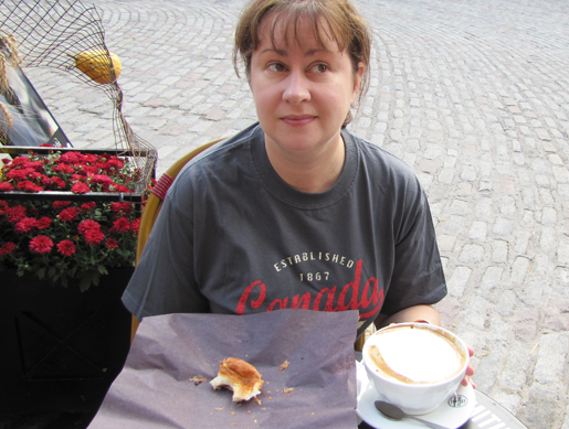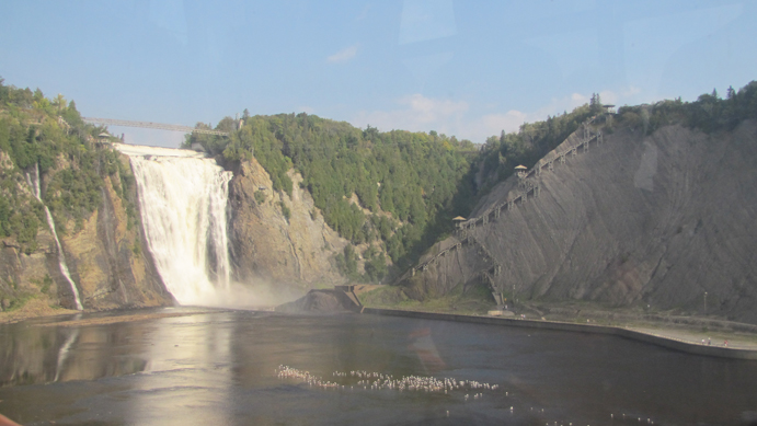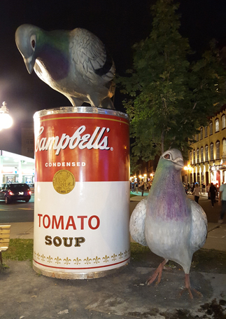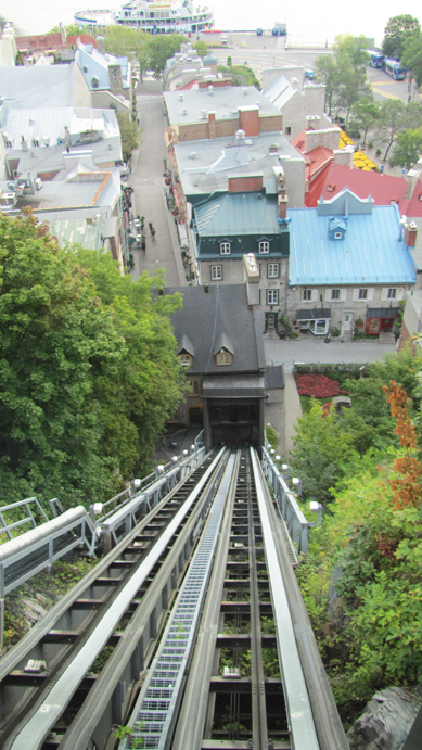 This street, forgot its name, is another really nice renovated area of town and they have these huge lanterns hanging over the street that light up at night. Me with the largest cup of coffee I've ever had. Kick ass. Ascending the Funicular in the old city to get to the Château Frontenac on the hill. One of the routes for the bus was to Montmorency Falls just outside of town. It was rather pretty but there was nothing to do there other than walk up and over the falls. We did not venture down the staircase on the right, though! Back in old Québec, a view of one of the old fortress gates. I love when old fortress walls are preserved! Lastly, the elusive Campbell's and pigeon statue. It was difficult to get a photo of while we were on the bus because of trees and we couldn't get close enough to it for a clear shot. However, on our last night in town, it was late and dark and we decided that we just wanted to get some pizza or something fast to eat before bedtime. We ended up walking a very long distance to arguably a very good pizza place, and lo and behold! The pigeon statue was right there. Score!