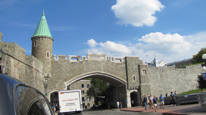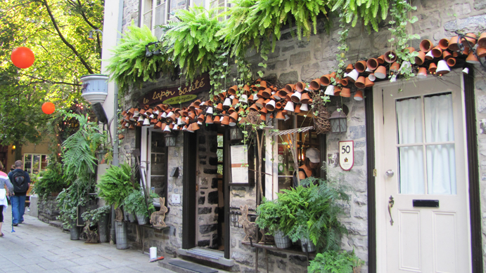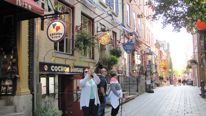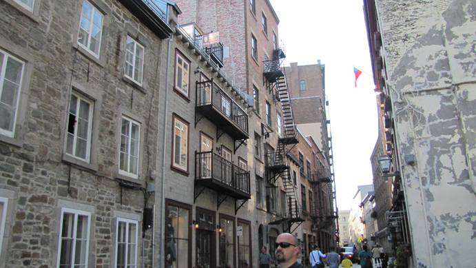 How adorable is this!? This is a restaurant called "Le Lapin Sauté" or The Leaping Rabbit! Here is the whole troupe--Leah, JC and Joyce--on one of these quaint streets filled with shops. The "Cochon Dingue" restaurant behind us was just too cute. It means Silly Pig. A gorgeous view from the street of the Château Frontenac on the hill, another street of old buildings, and a little bit of the fortress wall on the bottom right.