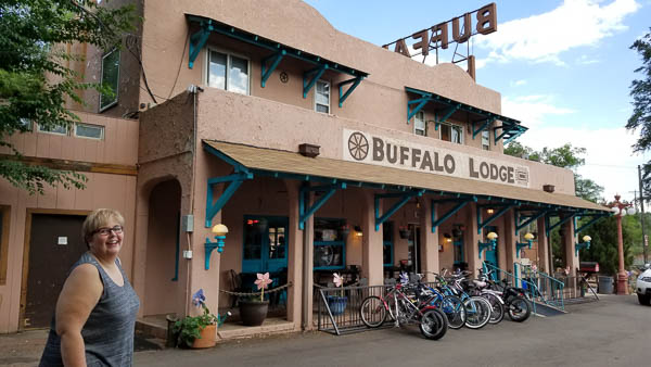 Then we met up with our friend Cathy and the three of us checked into the cutest bicycle motel in Manitou Springs for the night, the Buffalo Lodge. That's Claire caught off guard.
