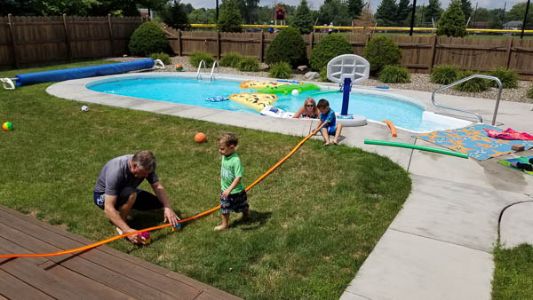 Dad built a huge race track with the boys. They were trying to get the cars to go into the pool.