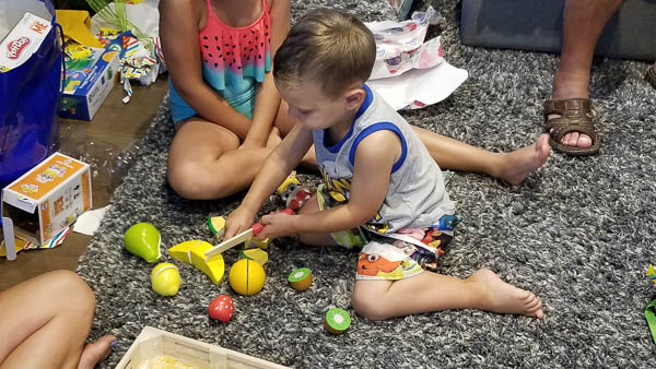 And here is Domenico playing with one of his new toys. It's a set of wooden fruit that has velcro between the pieces so he can 'cut' them apart.